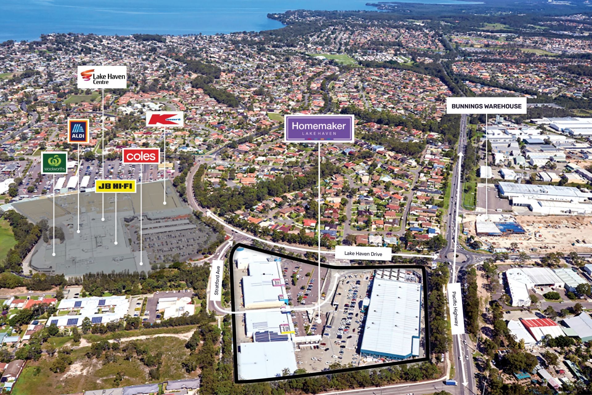 Prime location along the Pacific Highway and Lake Haven Drive. Homemaker Lake Haven sits adjacent to Lake Haven Centre, with 7.5 million visitors annually.* Retailers include Coles, Aldi, Kmart, JB Hi-Fi and Woolworths.